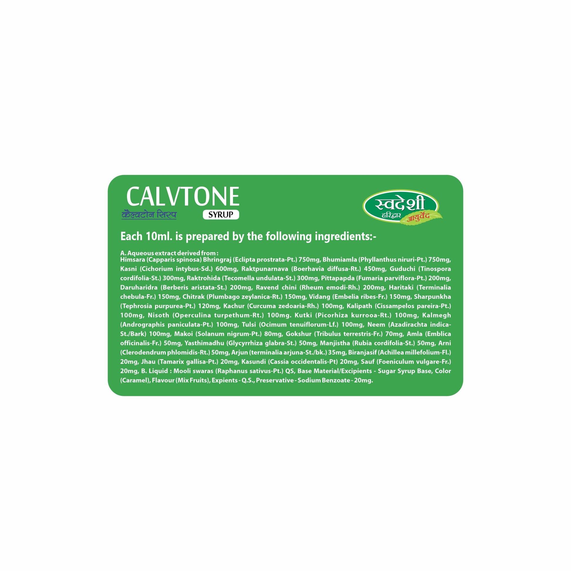 Swadeshi Calvtone Syrup is a natural Ayurvedic calcium and mineral-rich formulation designed to support bone strength, joint health, and overall vitality. Enriched with herbs and natural sources of calcium, it helps improve bone density, supports healthy growth in children, and provides strength and stamina to all age groups.