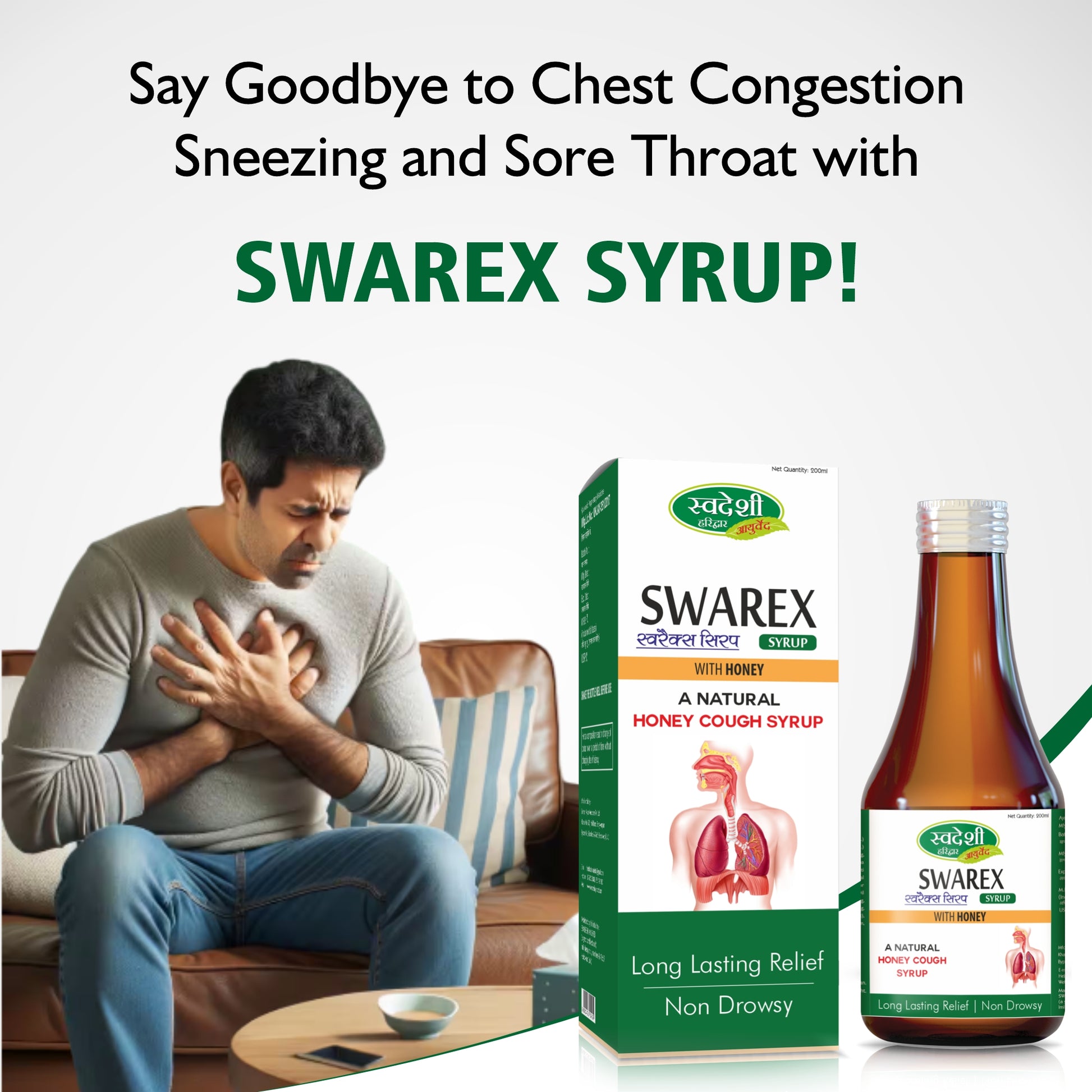 Swadeshi Swarex Syrup is a classical Ayurvedic herbal formulation designed to support respiratory health and relieve cough, cold, and throat irritation naturally. Prepared with potent herbs like Tulsi, Mulethi, Pippali, and Vasaka, this syrup soothes the respiratory tract, strengthens lungs, and promotes easy breathing.