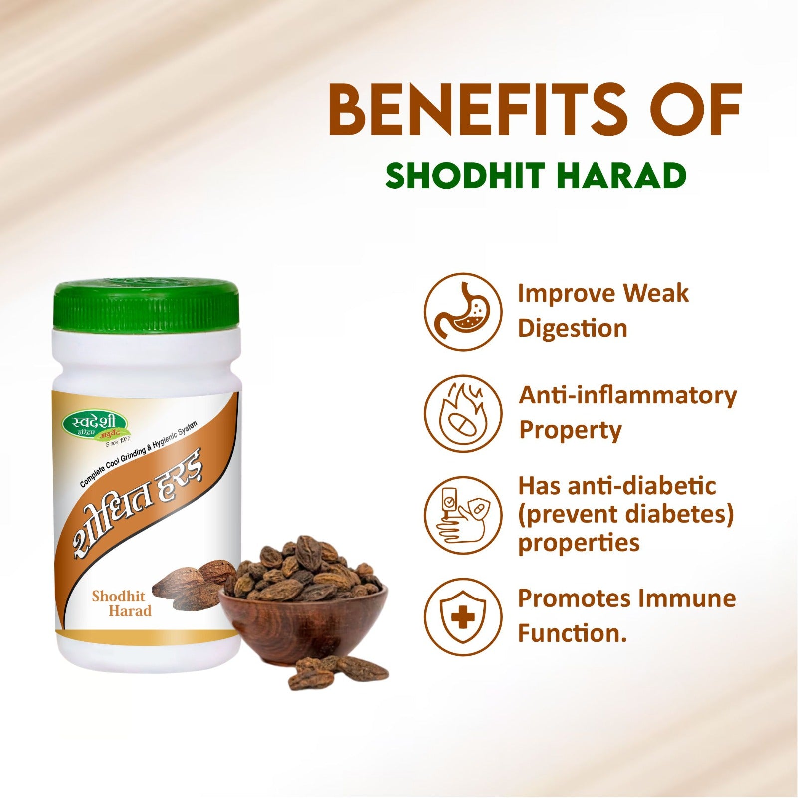 Swadeshi Shodhit Harad is a natural wellness supplement designed to support digestive health and overall well-being. Enriched with the goodness of Harad (Terminalia chebula) and other beneficial ingredients, this formulation helps maintain a healthy digestive system, promotes appetite, and supports general health.