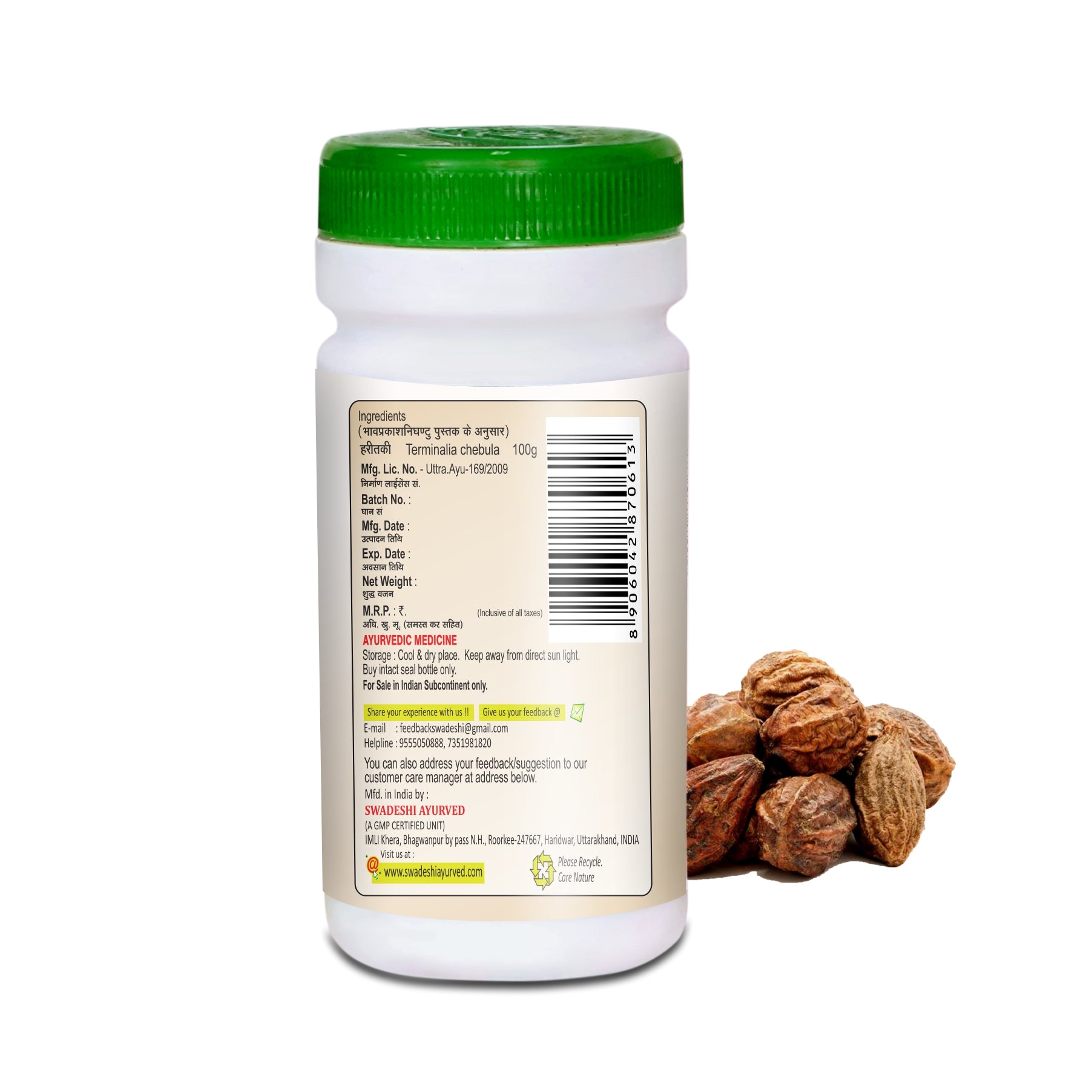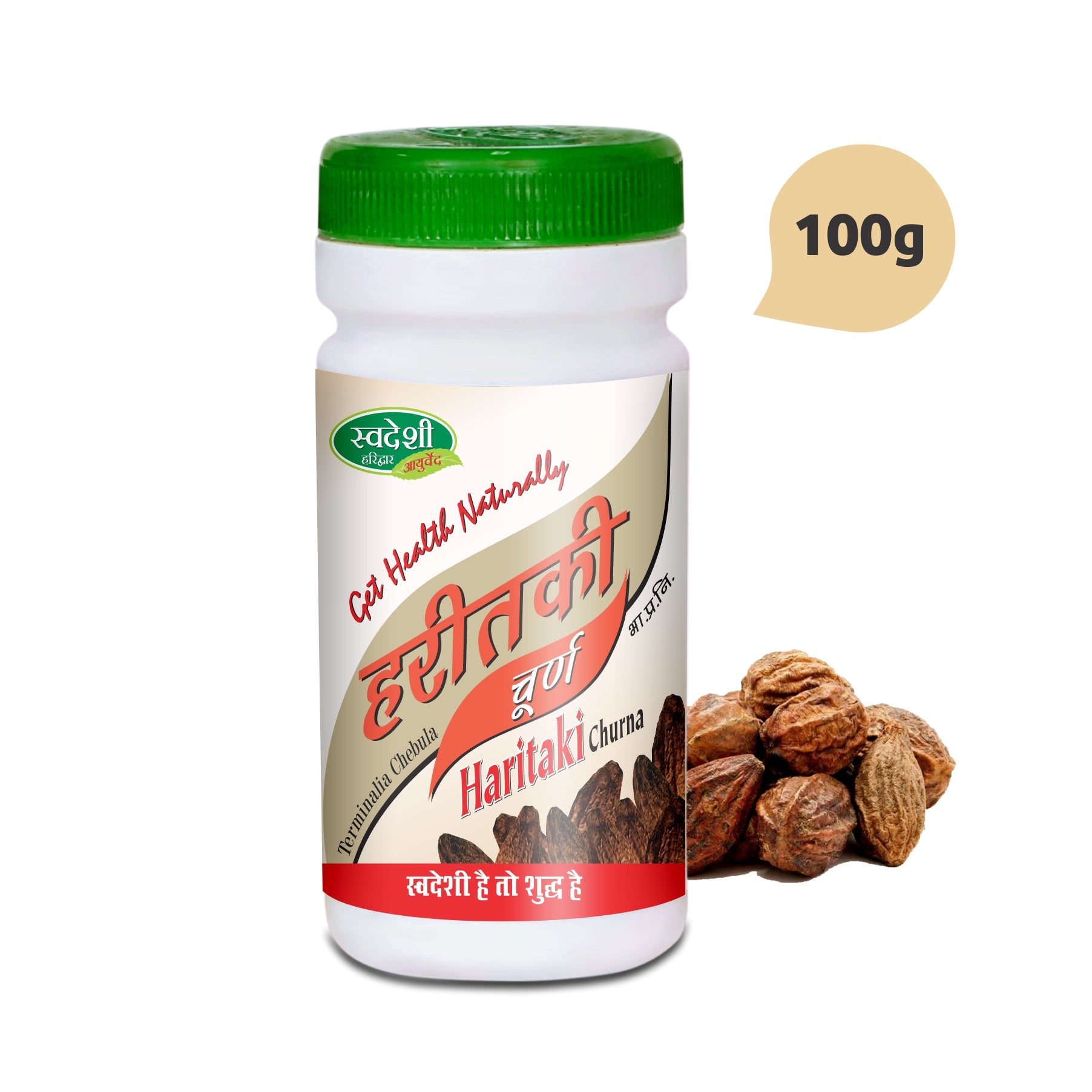 Swadeshi Haritaki Churna is a natural supplement formulated with terminalia chebula or haritaki that promotes a healthy gut. It helps to boost the immune system and fight microbes in the body. It has laxative properties, which help improve digestion and prevent constipation.