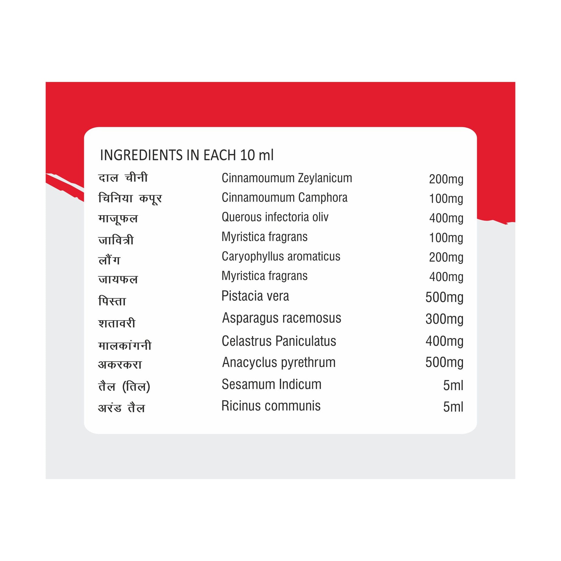 Cinnamoumum zeylanicum (200 g), Cinnamoumum camphora (100 mg), Quercus infectoria oliv (400 mg), Myristica fargrans (100 mg), Caryophyllus aromaticus (200 mg), Myristica fragrans (200 mg), Pistacia vera (500 mg), Asparagus racemosus (300 mg),Celastrus paniculatus (400 mg), Anacyclus pyrethrum (500 mg), Sesamum indicum (5 ml), Ricinus communis (5 ml)