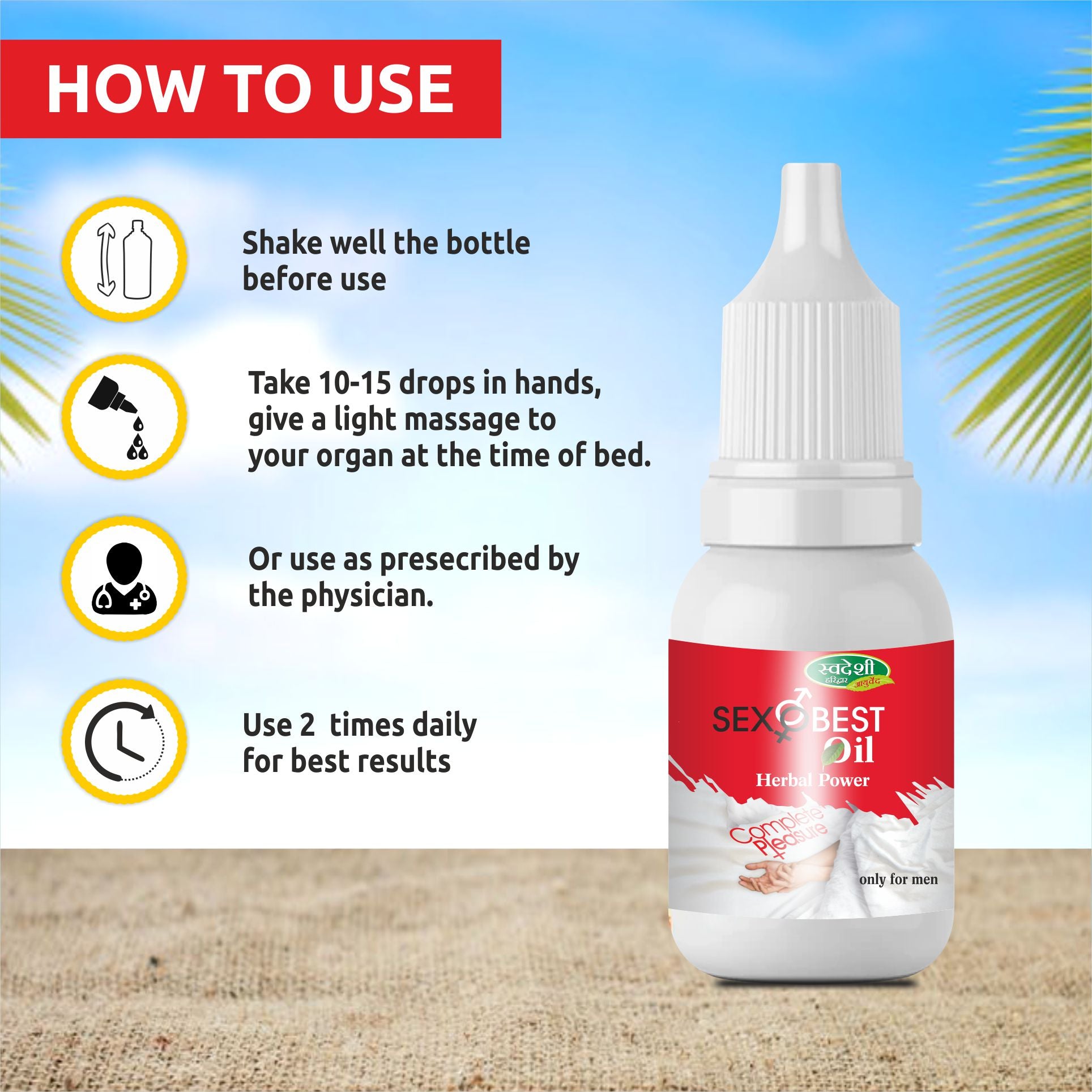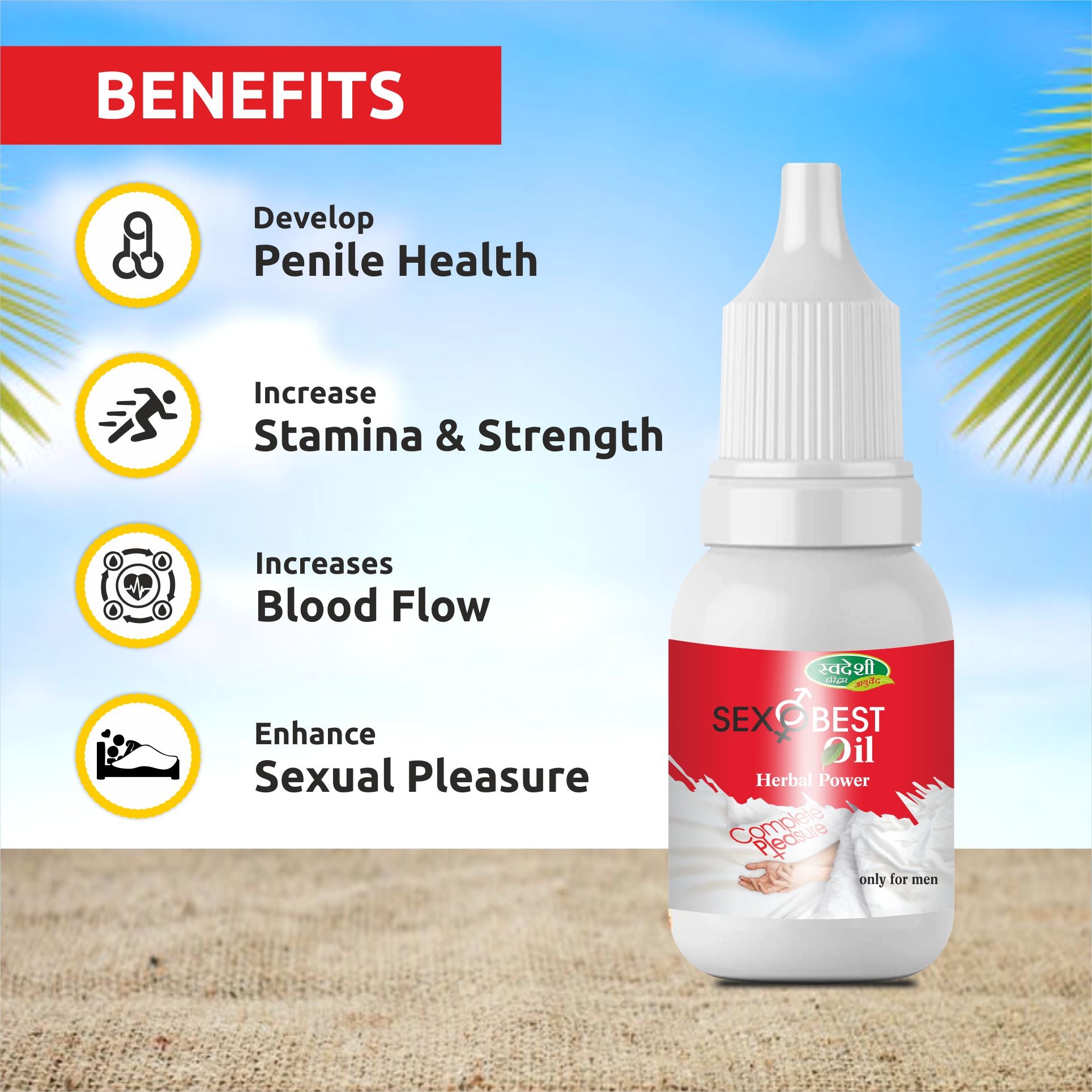 Swadeshi Sexobest Oil improves performance by increasing stamina and strength in the body. It includes the herbs which promotes blood circulation and reduces inflammation in the genital organs, and also used in the treatment of male infertility and improves sperm count and motility.