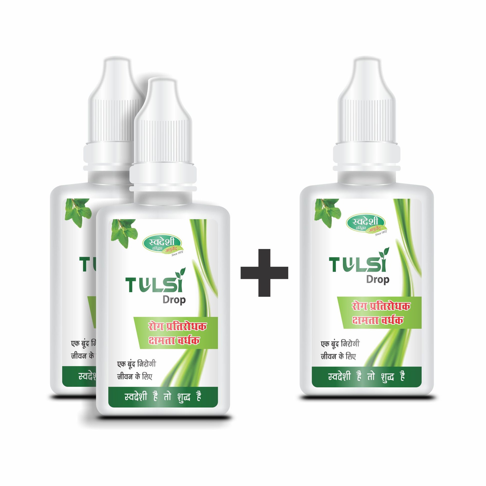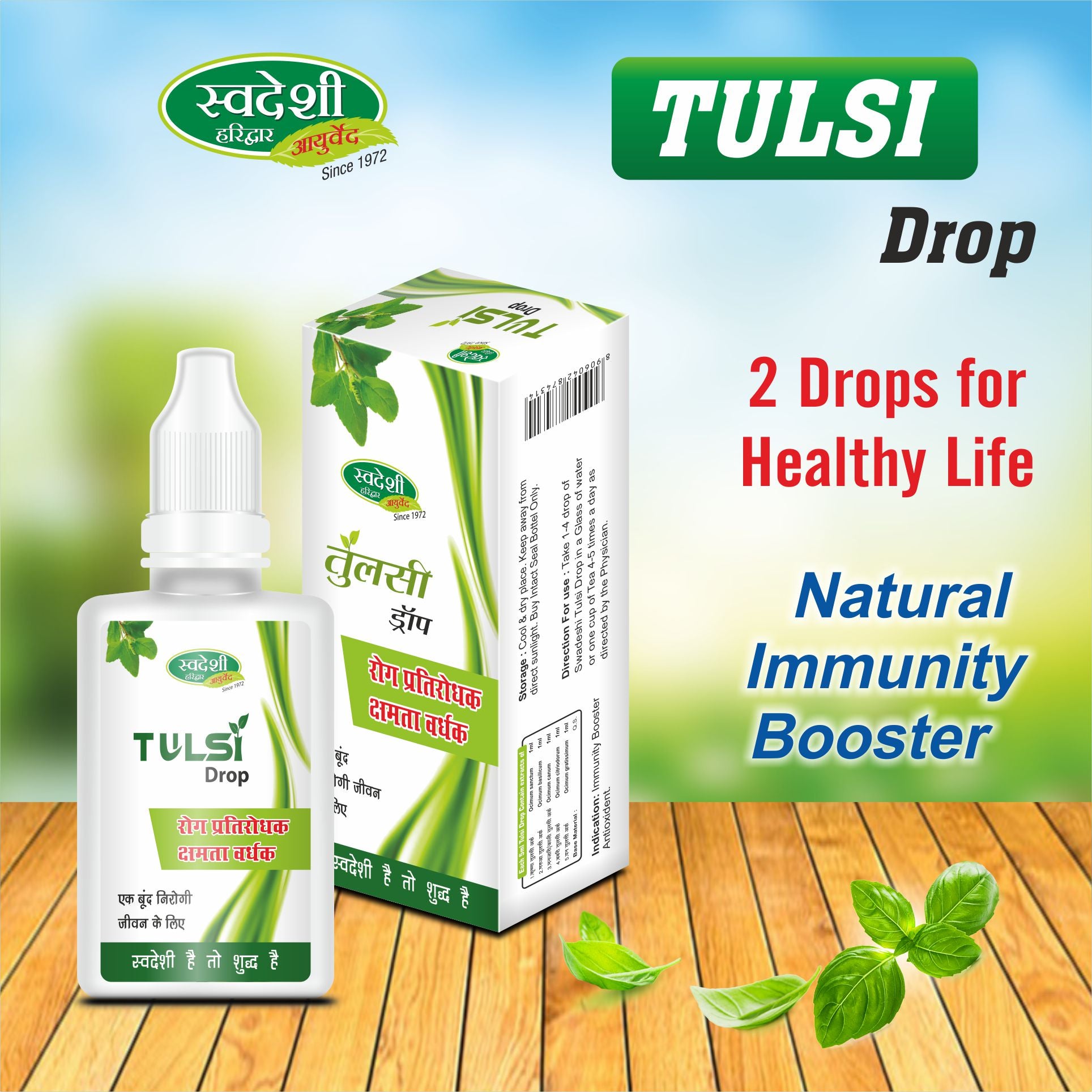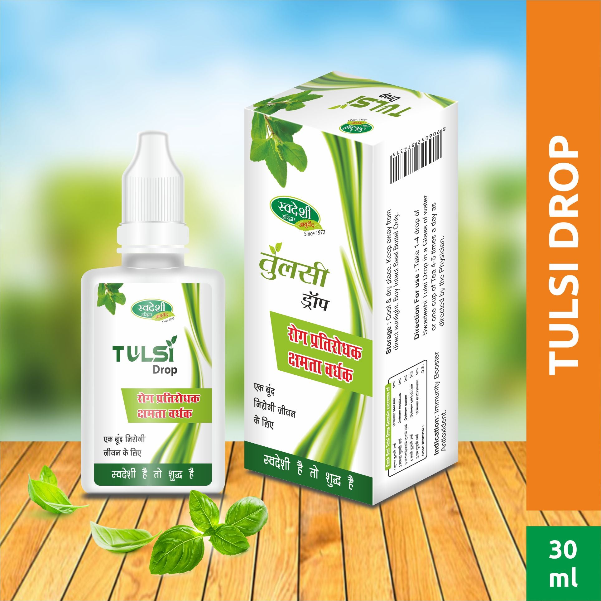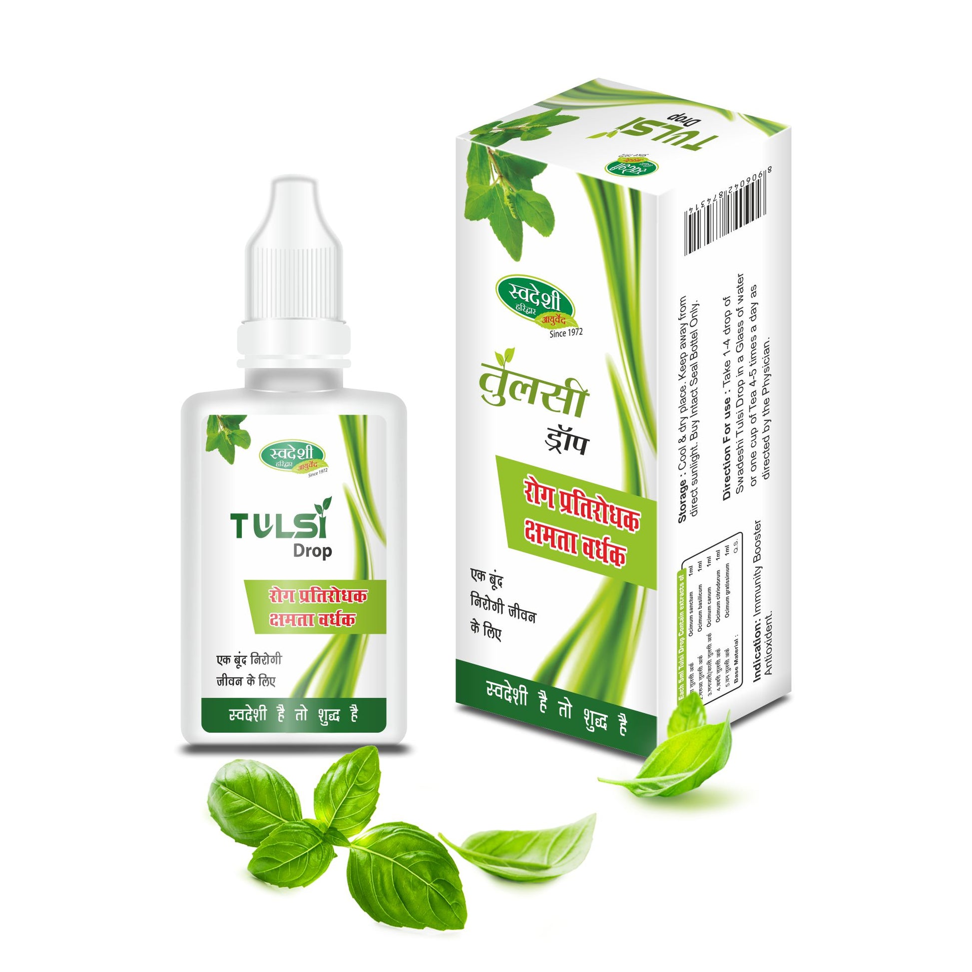- Swadeshi Tulsi Drops improves the body’s overall defence mechanism and helps to mobilize mucus in bronchitis and asthma