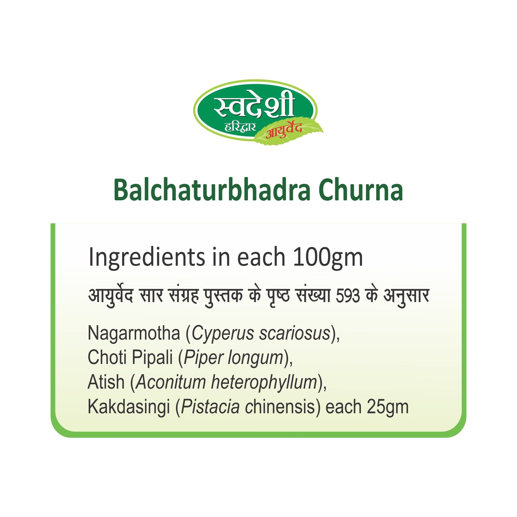 Nagarmotha (Cyperus scariosus), Choti papali (Piper longum), Atish (Aconitum heterophyllum), Kakrashringi (Pistacia chinensis) each 25 gm