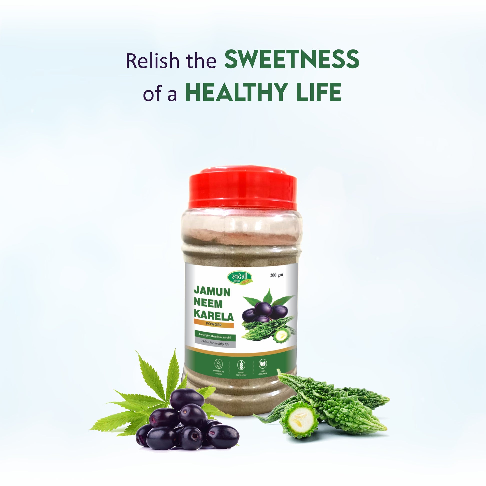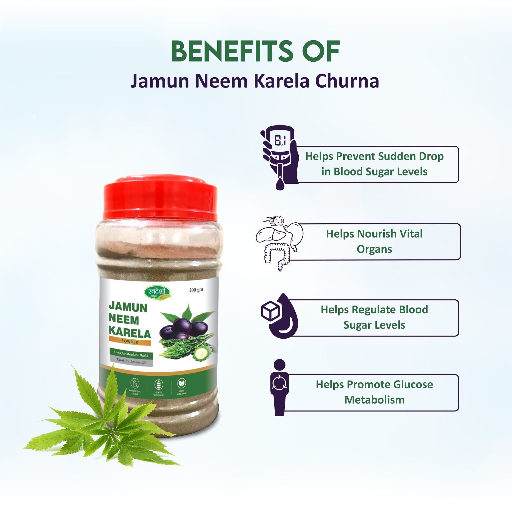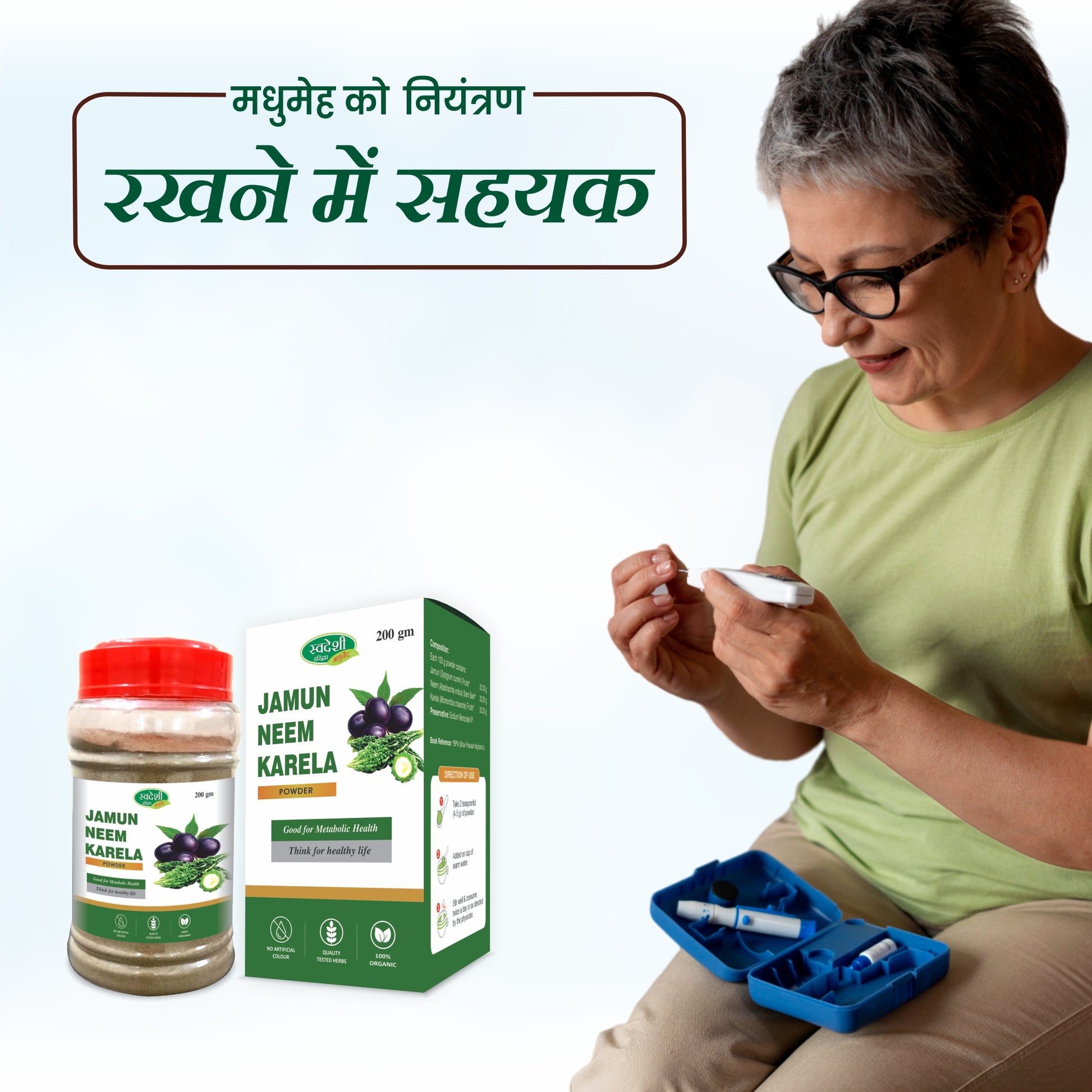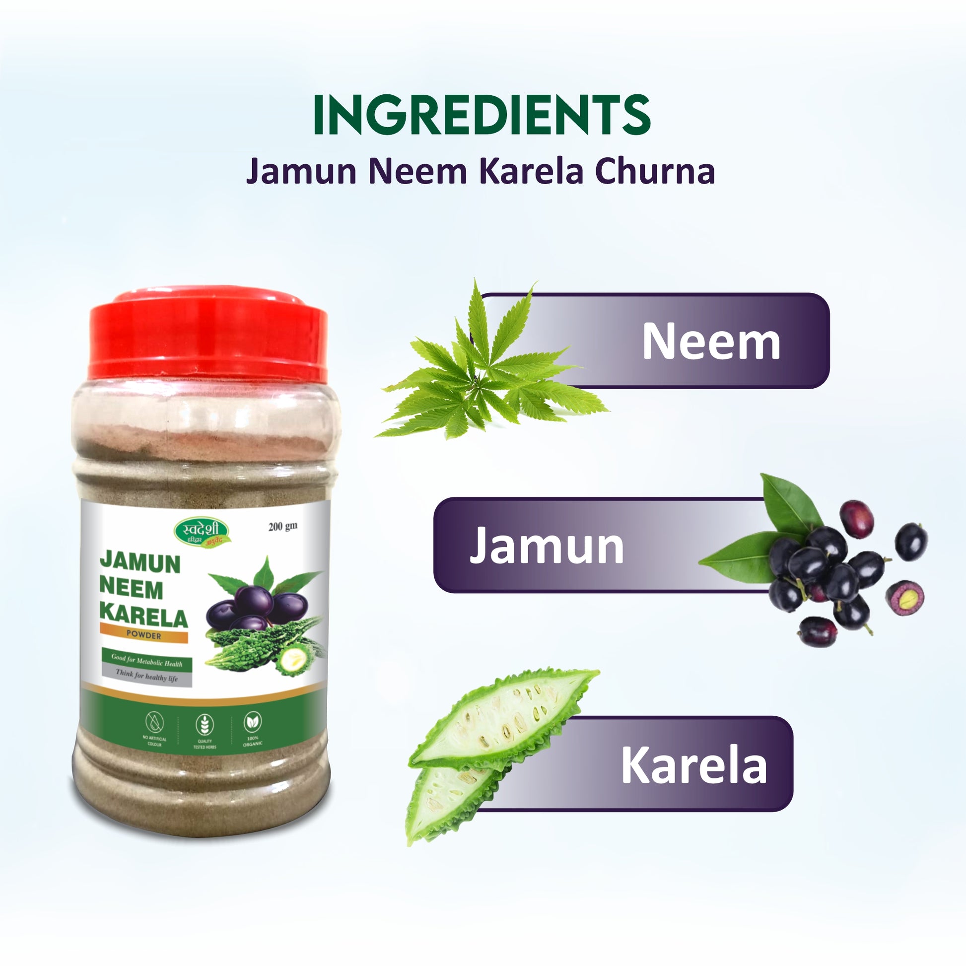 Swadeshi Ayurved Jamun Neem Karela Churna is a traditional Ayurvedic formulation made from three powerful herbs – Jamun (Indian Blackberry), Neem and Karela (Bitter Gourd). These herbs have been valued in Ayurveda for generations for their role in maintaining overall health, supporting digestion, and promoting healthy metabolism.