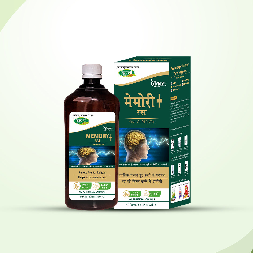 Introducing Swadeshi Memory Ras, a blend of Ayurvedic herbs like Amla, Shankhpushpi, and Brahmi. This formula relieves mental fatigue, enhances mood, and supports cognitive function. Experience natural brain boost and emotional balance with Swadeshi Memory Ras.
