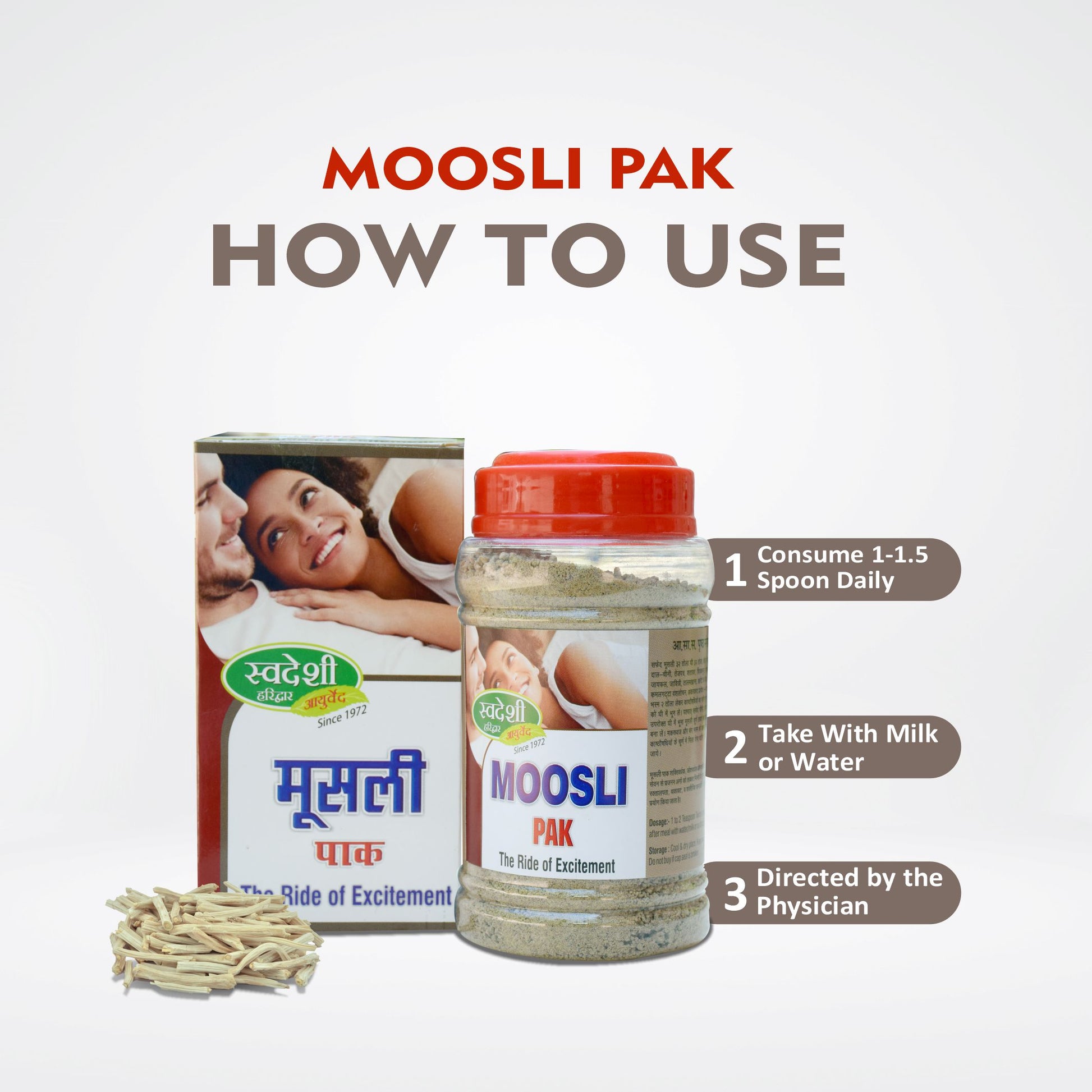 Consume 1 to 1.5 teaspoons of Swadeshi Moosli Pak daily with milk or water. For best results, follow the dosage as directed by your physician.