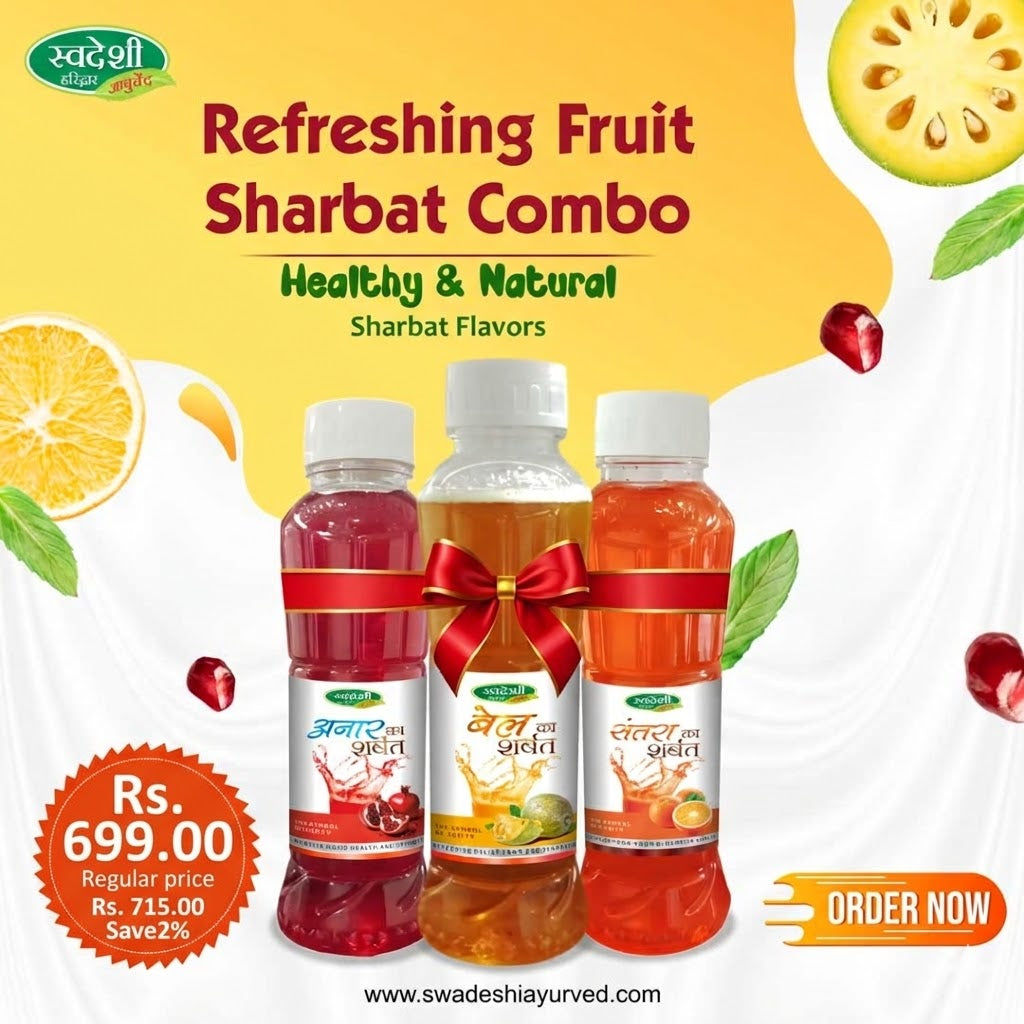 మీ దాహాన్ని తీర్చుకోండి మరియు మా రిఫ్రెష్ ఫ్రూట్ షర్బత్ త్రయంతో మీ శరీరాన్ని పునరుజ్జీవింపజేయండి, ఇందులో సహజమైన మంచితనంతో కూడిన మూడు అద్భుతమైన సమ్మేళనాలు ఉన్నాయి. బెల్, అనార్ మరియు సంత్రా షర్బత్ యొక్క పునరుజ్జీవన రుచులను ఆస్వాదించండి, ప్రతి ఒక్కటి ప్రత్యేకమైన ఆరోగ్య ప్రయోజనాలను అందిస్తూ మీ ఉత్సాహాన్ని పెంచడానికి మరియు మీ ఇంద్రియాలను ఉత్తేజపరిచేందుకు అందిస్తుంది.