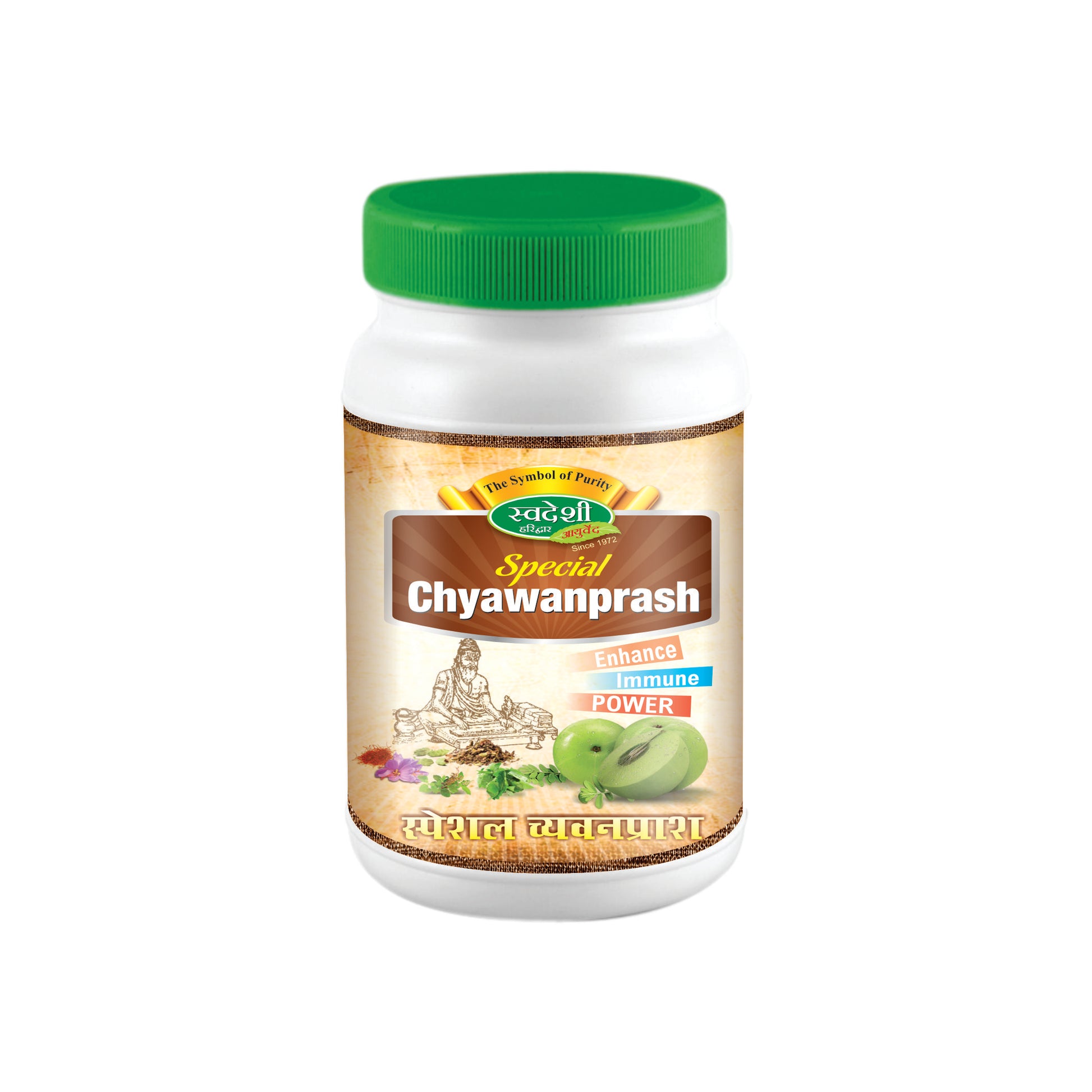 స్వదేశీ స్పెషల్ చ్యవన్ప్రాష్ అనేక ఆరోగ్య ప్రయోజనాలతో కూడిన పురాతన ఆయుర్వేద మూలికా సూత్రీకరణ. ఈ ప్రత్యేకమైన చ్యవాన్ప్రాష్ స్వచ్ఛమైన మరియు సేంద్రీయ సహజ మూలికలతో పాటు సరైన నిష్పత్తిలో సుగంధ ద్రవ్యాలతో తయారు చేయబడింది. ఇది అంటువ్యాధులు మరియు వ్యాధులకు వ్యతిరేకంగా శరీరం యొక్క సహజ రక్షణను బలపరుస్తుంది. ఇది మొత్తం శరీరాన్ని పునరుద్ధరిస్తుంది మరియు పునరుజ్జీవింపజేస్తుంది. ఇది అభ్యాసం, జ్ఞానం మరియు జ్ఞాపకశక్తిని మెరుగుపరుస్తుంది కాబట్టి దీనిని బ్రెయిన్ టానిక్ అని కూడా పిలుస్తారు. ఈ ఆయుర్వేద టానిక్ శ్వాసకోశ వ్యాధుల చికిత్సలో గొప్ప సహాయం మరియు జలుబు, దగ్గు, జ్వరం మరియు ఆస్తమాలో అత్యంత ప్రభావవంతమైనది.